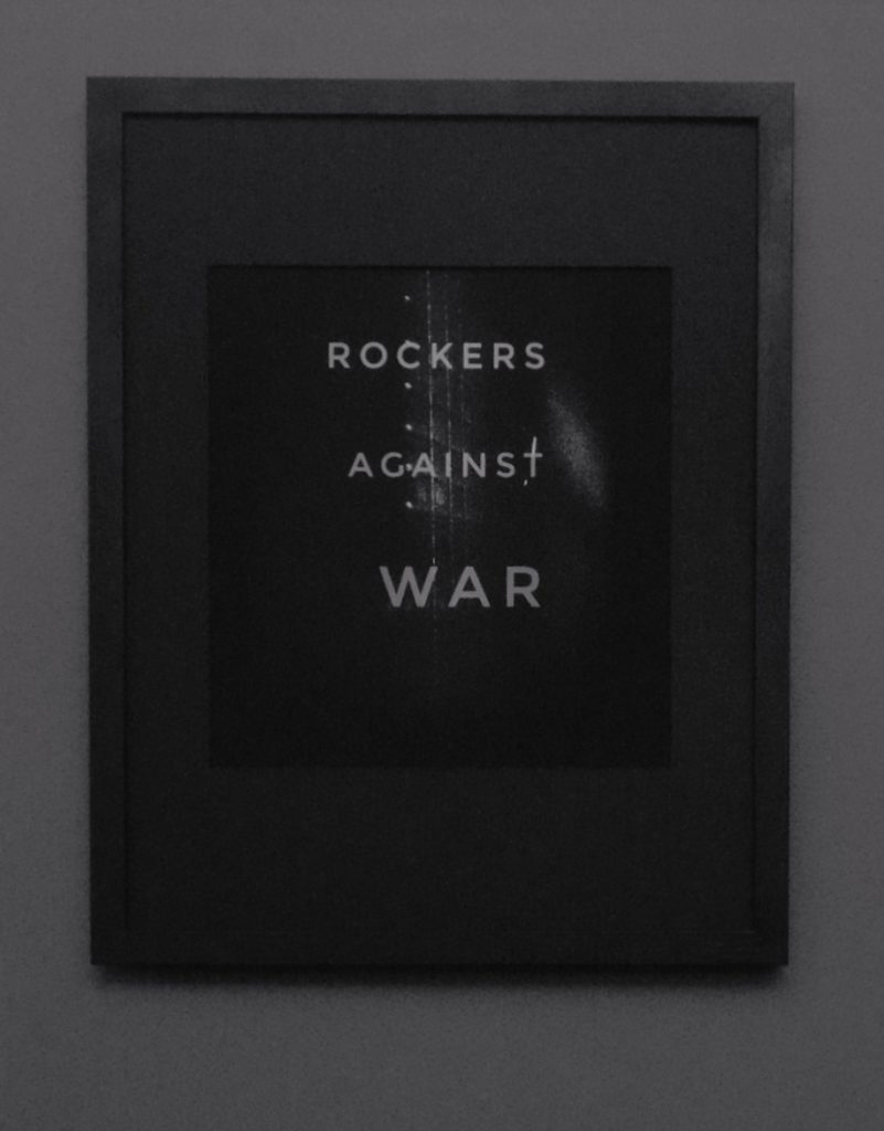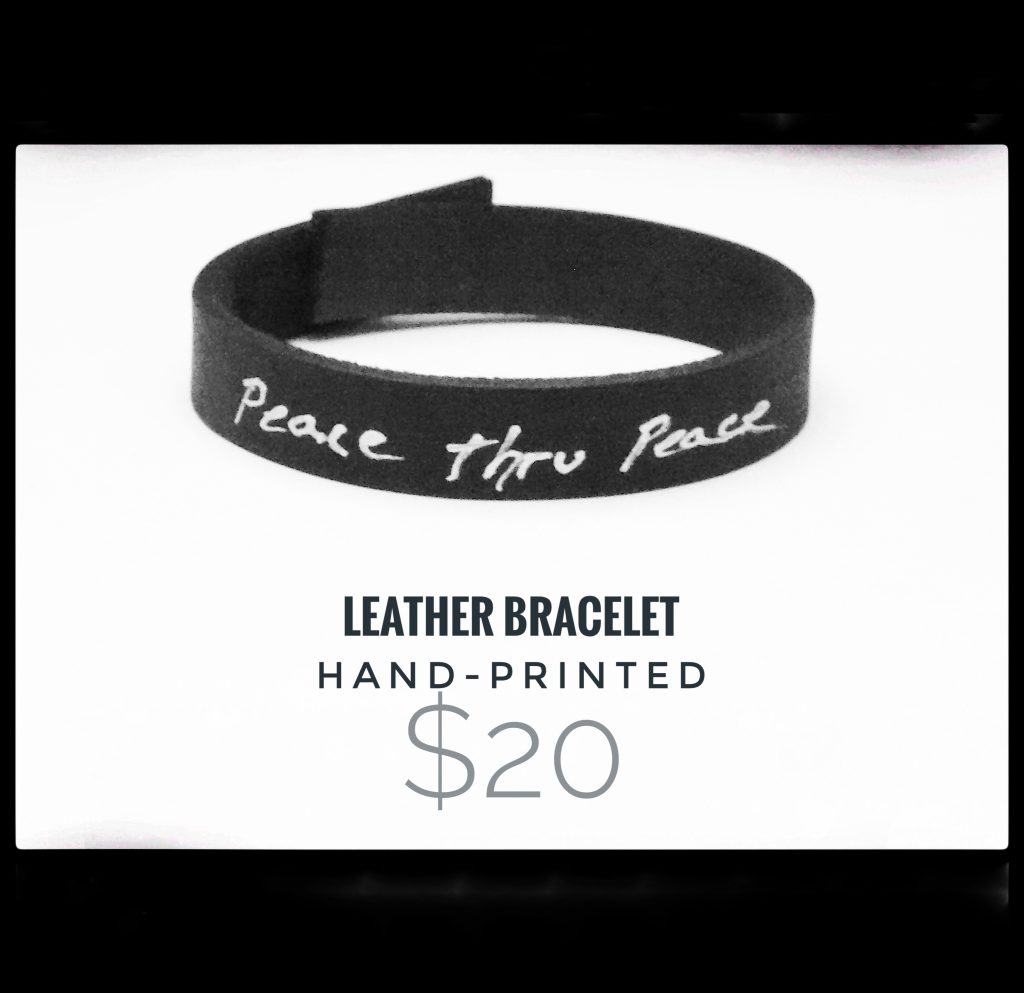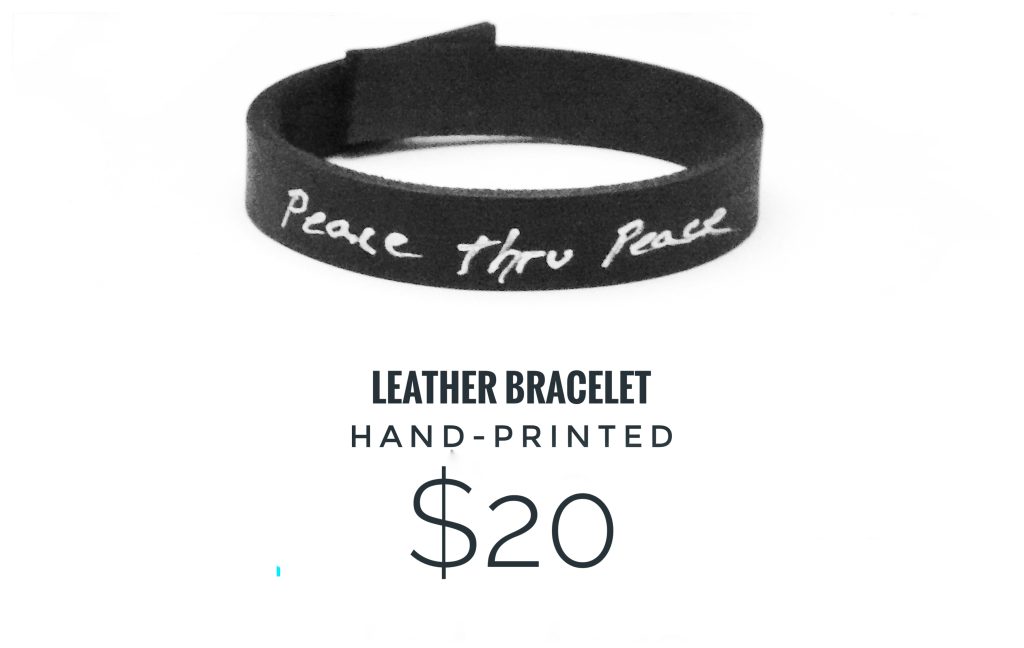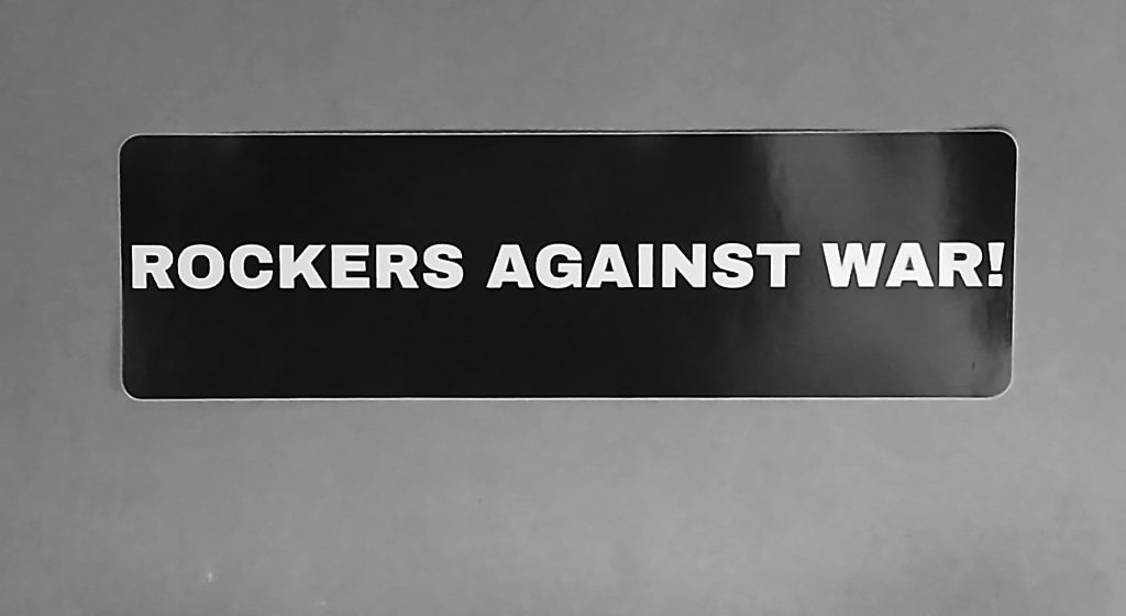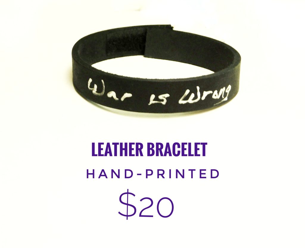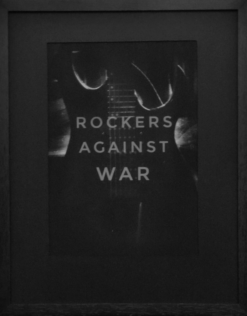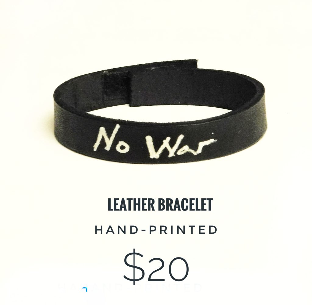 Peace thru Peace leather bracelet: $20. Bracelets are handprinted: some variation will occur. (shipping and tax included)No War black leather bracelet :$20 (includes shipping and tax)War is Wrong black leather bracelet: $20 (includes shipping and tax)3″x10″ peace thru peace bumper sticker: $6 (includes taxes and mailing)#7) NO WAR: 8″x10″ framed, with both tabletop and wall mounts. Price $50 (includes taxes and shipping)#4) Rockers Against War; Roughly 8″x9″ photo inside 11″x14″ matte, Wood Framed. Price: $80 (includes sales tax & shipping).#5) War is Not Healthy: Roughly 7″x9″ photo inside 11″x14″ matte, framed (frame not shown above but included). Price: $70 (includes taxes and shipping).#3) The People Against War; Roughly 7&1/2″ x 9″ photo inside 11″ x 14″ matte, framed (frame not shown above but included) Price: $80 (includes sales tax & shipping).#8) Calvary, 8″x10″ Photo, Framed. Price $50. (Includes shipping & taxes)#6) No War, roughly 8″x10″ photo inside 11″x14″ matte, engineer WOOD FRAMED: Price: $80 (includes taxes and shipping)#1) The People Against War; 7″x9″ photo inside “11×14″ (exterior dimension) matte. The matted photo will fit inside a standard 11″x14” frame. Price: $80, includes sales tax & shipping.#8) Rockers Against War. Roughly 8″x10″ photo inside an 11″×14″ matte, Engineered Wood Fame. Price: $80.